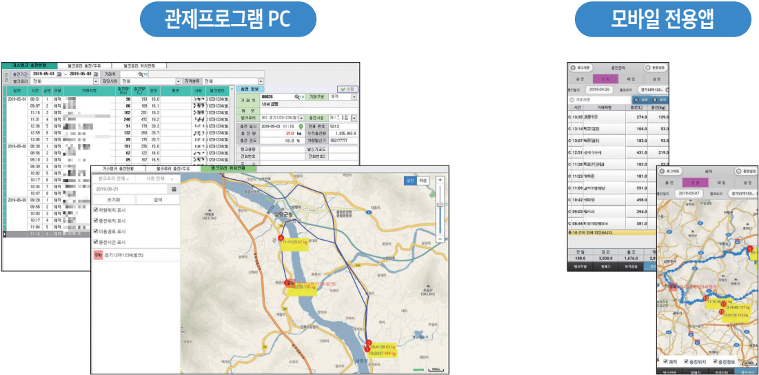 가스충전 위치, 시간, 온도, 충전량, 이동경로 등등의 정보를 실시간으로 관제서버에 전송한 데이터를 분석하여