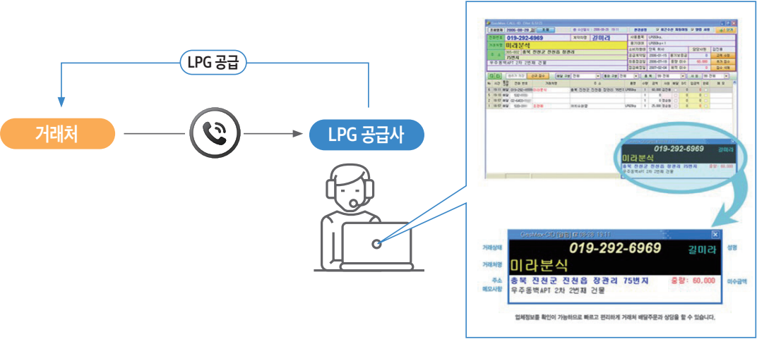 어느 거래처에서 전화 왔는지 즉시 확인 가능하므로 빠르고 편리하게 거래처 배달 주문 및 상담을 할 수 있습니다. -