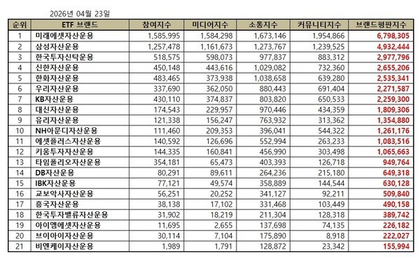 한국기업평판연구소는 ETF 발행기업 21개 브랜드에 대해 2026년 3월 23일부터 2026년 4월 23일까지의 ETF 발행기업 브랜드 빅데이터 35,227,672개를 분석한 결과 지난 3월 ETF 발행기업 브랜드 빅데이터 28,932,811개와 비교하면 21.76% 증가했다고 밝혔다.