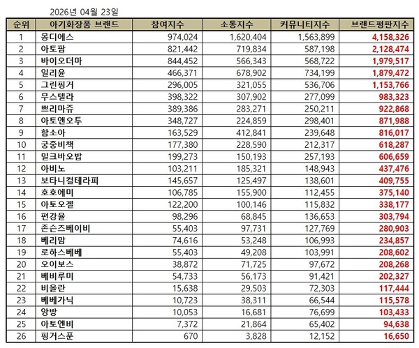 2026년 4월 아기화장품 브랜드평판 순위는 몽디에스, 아토팜, 바이오더마, 일리윤, 그린핑거, 무스텔라, 쁘리마쥬, 아토앤오투, 함소아, 궁중비책, 밀크바오밥, 아비노, 보타니컬테라피, 호호에미, 아토오겔, 편강율, 존슨즈베이비, 베리맘, 로하스베베, 오이보스, 베비루미, 비올란, 베베가닉, 앙방, 아토엔비, 핑거스푼 아기화장품 순으로 분석됐다.