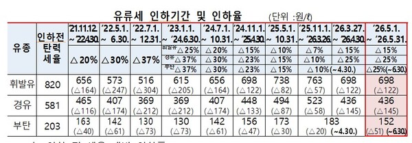 LPG의 경우도 중동전쟁에 따른 국제가격 변동 영향이 5월부터 본격 반영될 것으로 예상됨에 따라 소형트럭 등 주로 서민층이 많이 사용하는 부탄에 대한 유류세 인하폭을 현행 10%에서 5월부터 25%로 리터당 31원 내려 두달간 인하기간을 연장하기로 결정했다.