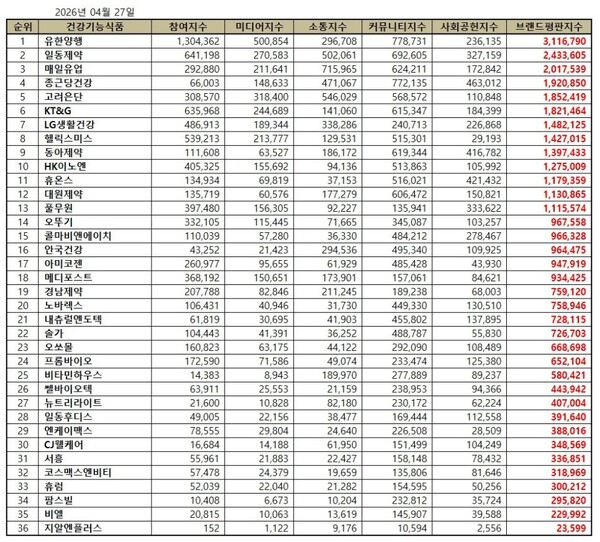 2026년 4월 건강기능식품 브랜드평판 30위 순위는 유한양행, 일동제약, 매일유업, 종근당건강, 고려은단, KT&G, LG생활건강, 헬릭스미스, 동아제약, HK이노엔, 휴온스, 대원제약, 풀무원, 오뚜기, 콜마비앤에이치, 안국건강, 아미코젠, 메디포스트, 경남제약, 노바렉스, 내츄럴엔도텍, 솔가, 오쏘몰, 프롬바이오, 비타민하우스, 쎌바이오텍, 뉴트리라이트, 일동후디스, 엔케이맥스, CJ웰케어 순으로 나타났다.