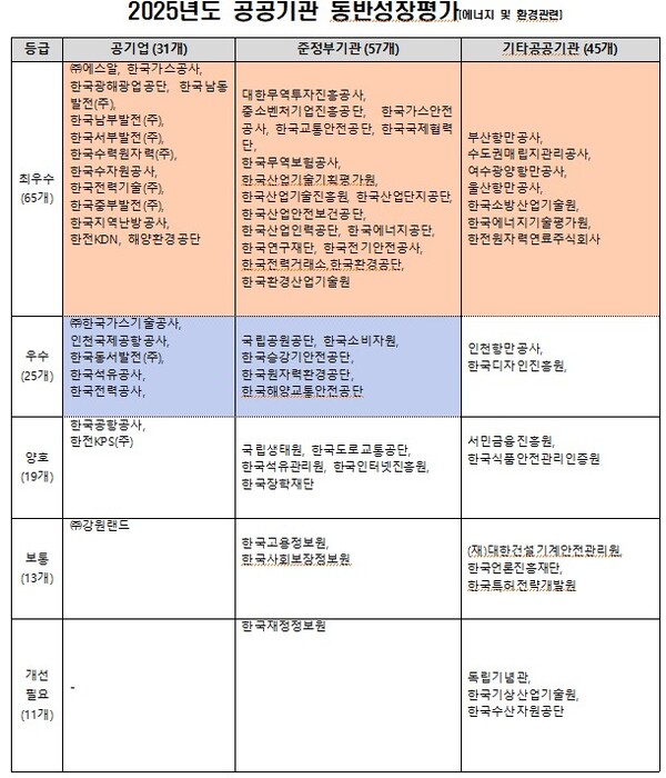 한국수자원공사, 한국전력기술(주), 한국중부발전(주), 한국지역난방공사, 한전KDN, 해양환경공단 등 65개 공공기관이 동반성장평가 결과 최우수 등급을 받았다.